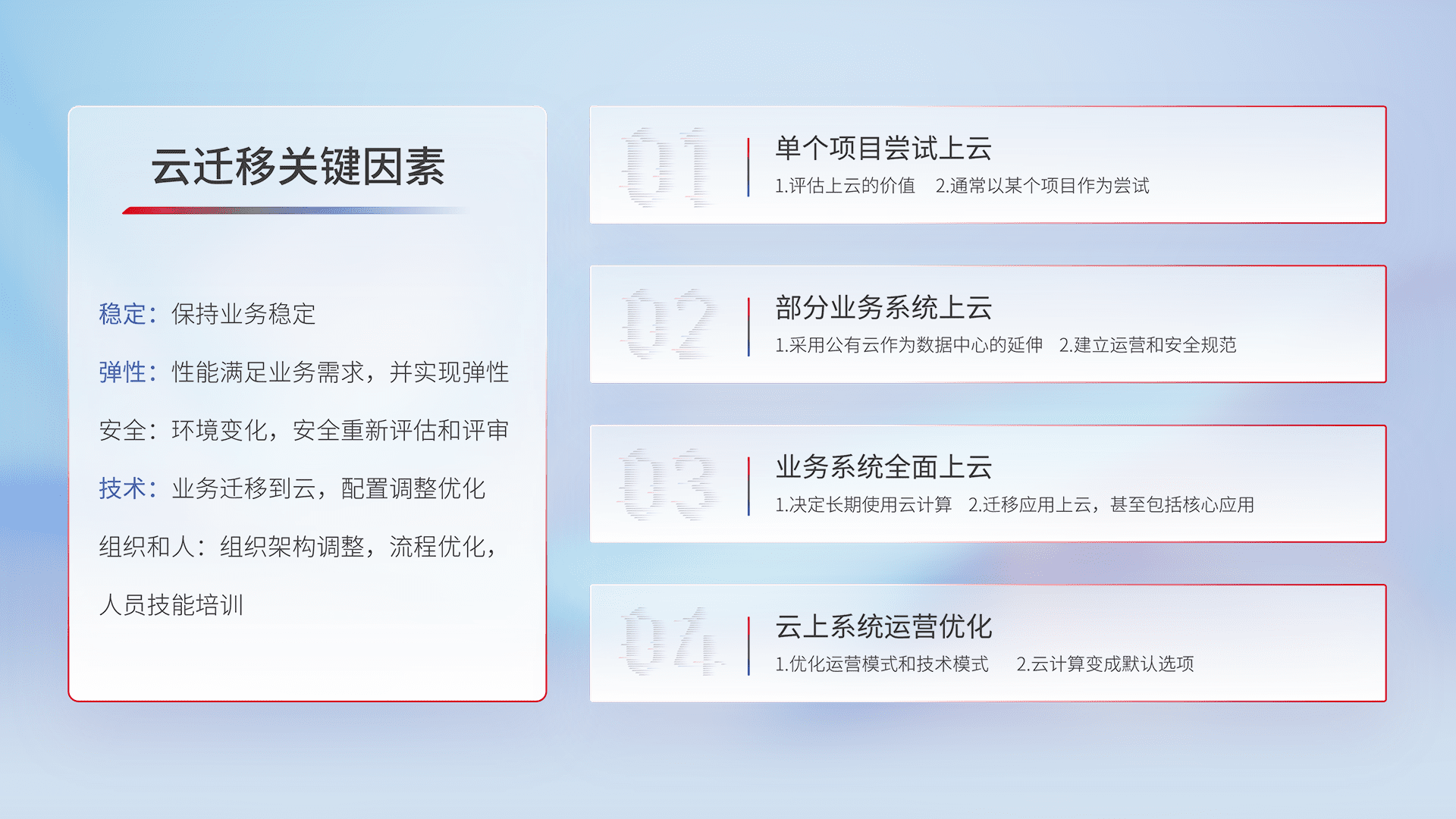 结合实际业务,,,从规划设计、、、、云平台选型、、、云原生改造、、、、数据迁移、、、、集成交付,,,迁移全过程为客户识别最佳上云路径,,,,做好风险识别管理,,,设计网络架构、、身份权限、、、、安全审计合规、、、、操作审计、、、日志审计、、、、监控告警策略、、多站点容灾设计等,,,,对云上基础设施进行整体规划,,提升IT治理水平,,以满足弹性、、、高可用、、、、高性能的需求。。。。